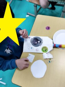 牛乳パックと新聞紙を使って、ラケットを制作しました。